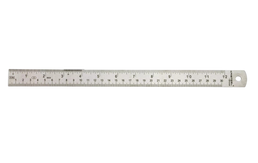 Front Side : Top edge 1/2 mm. Bottom edge : 1/16ths, 1/32nds, 1/64ths. Reverse side : Conversion - inches to mm. Type of Product : Metric Steel Ruler